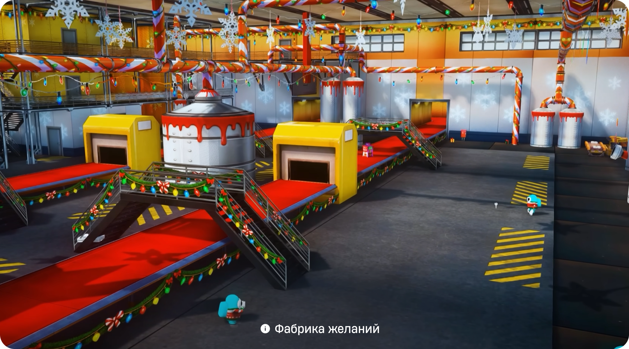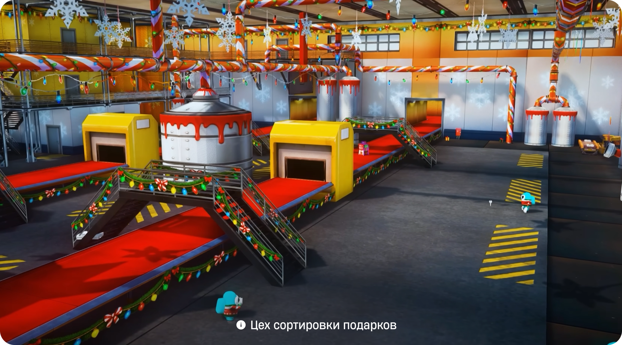 Для выполнения задания вам нужно отправится на упаковочный конвейер. На территории конвейера, вокруг, вы сможете найти подарки 4-х разных цветов: