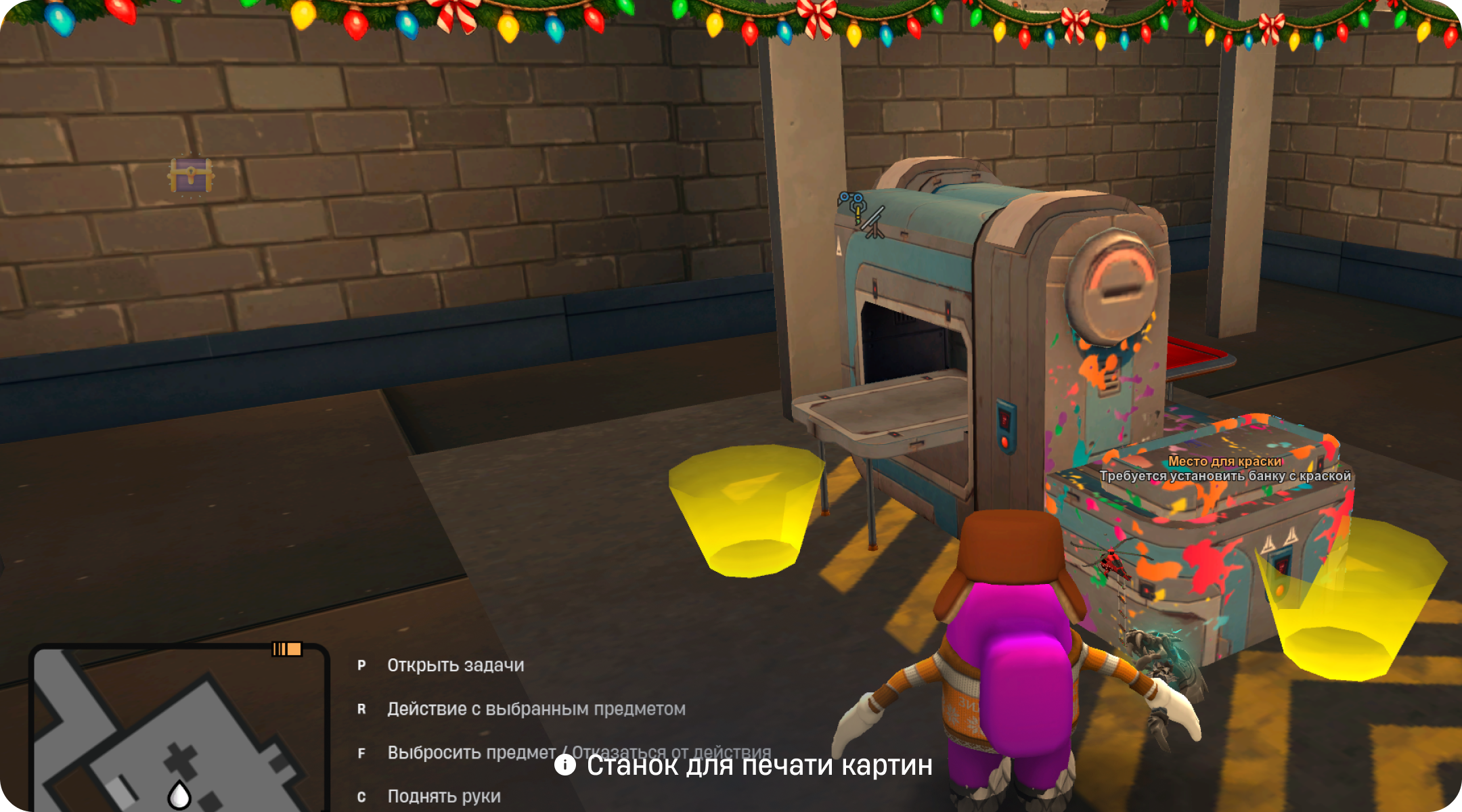 Там одному из вас необходимо будет сесть в погрузчик и завести его с помощью найденных ранее ключей, после чего загрузить подарок в погрузчик с одного из стеллажей. Второй участник должен встать за пульт управления лифтом.