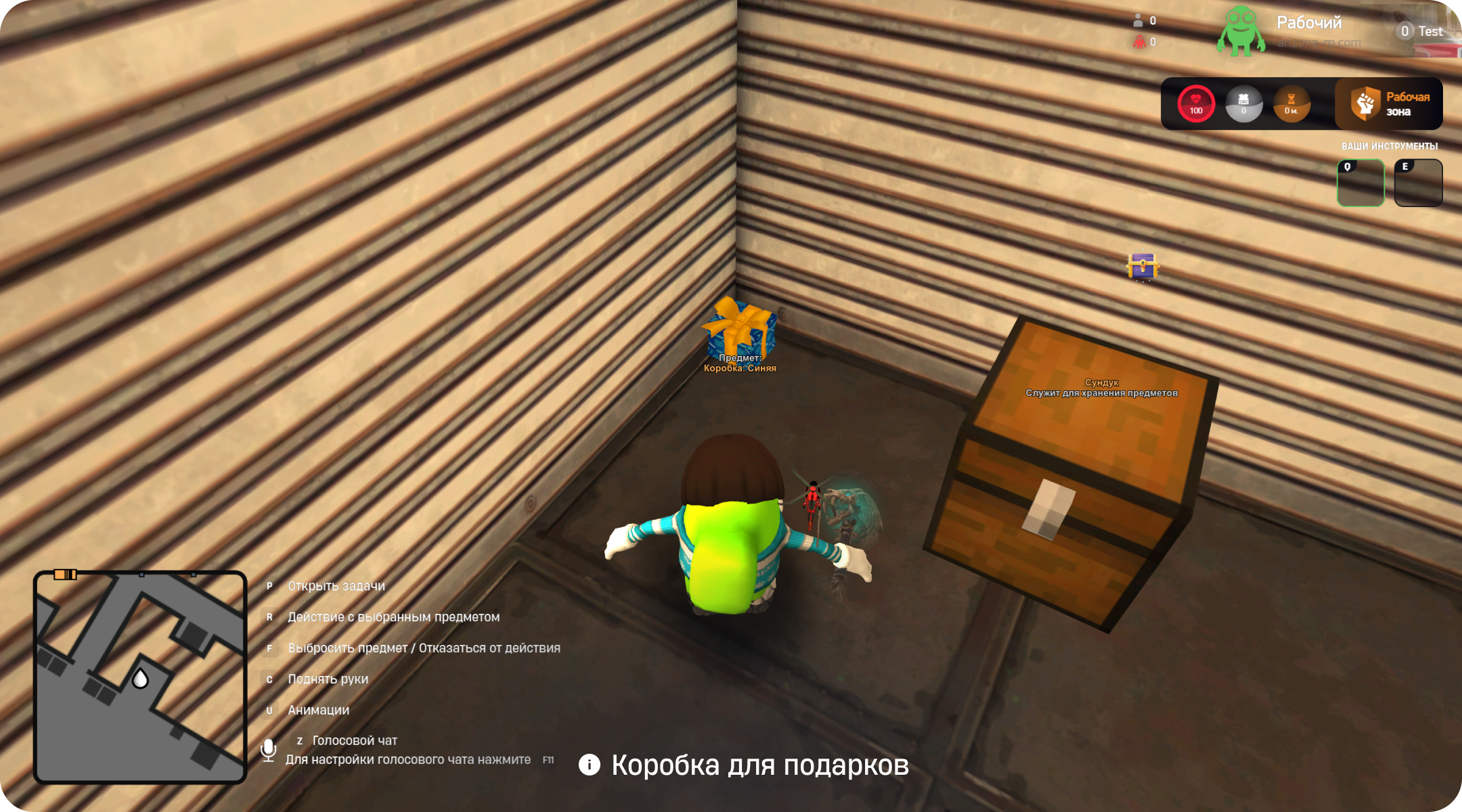 Поднявшись на второй этаж ангара, необходимо будет выгрузить подарок на отмеченный маркером стеллаж, затем обратно вернуться в лифт и спуститься на первый этаж.
