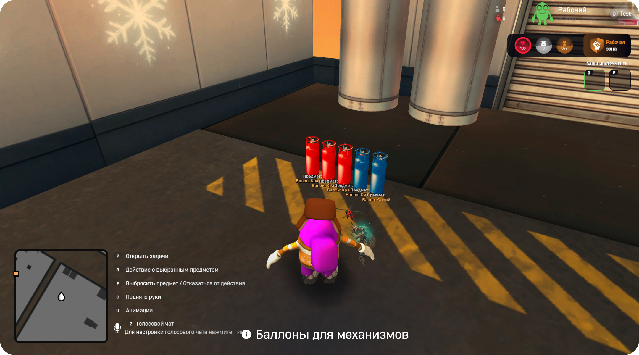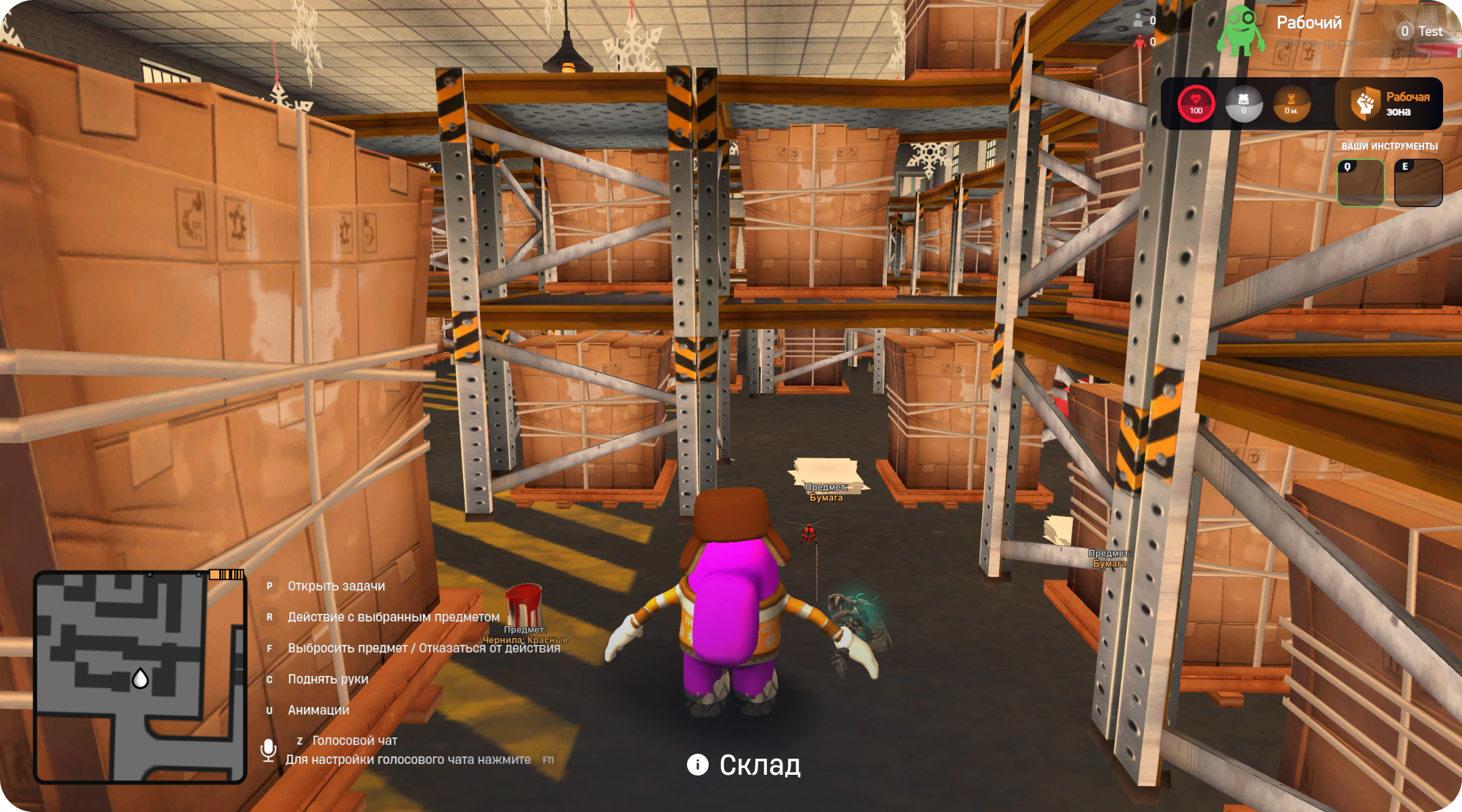 У вашего персонажа есть инвентарь, в который помещается 2 предмета. А сами предметы разбросаны по фабрике. В случае смерти, все предметы выпадают с вас. Вы можете как подбирать, так и выкидывать предметы;