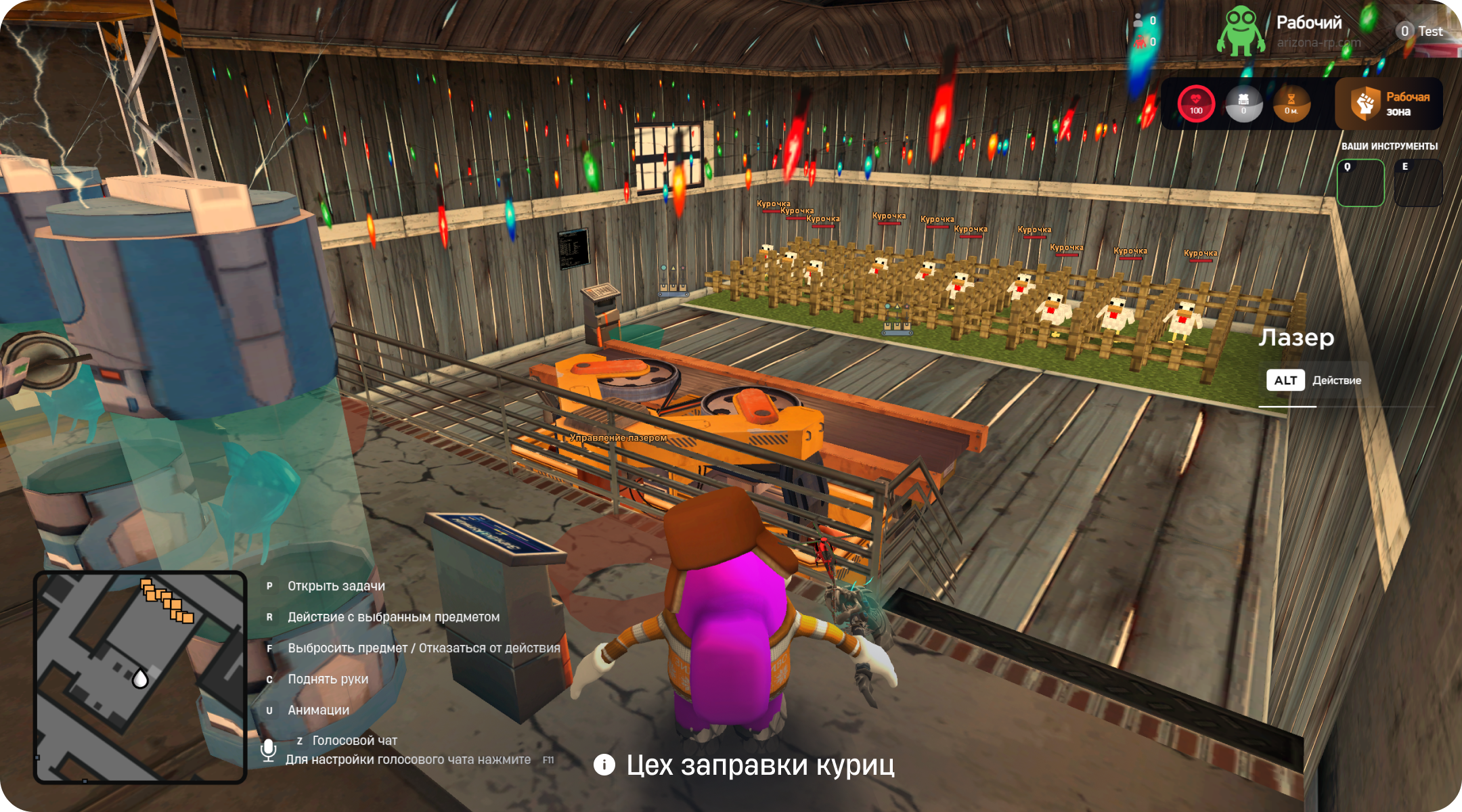 Пойманную курицу нужно посадить в колбу, которая находится на специальной стойке в локации, а затем установить колбу с курицей на постамент лазерной зарядки.