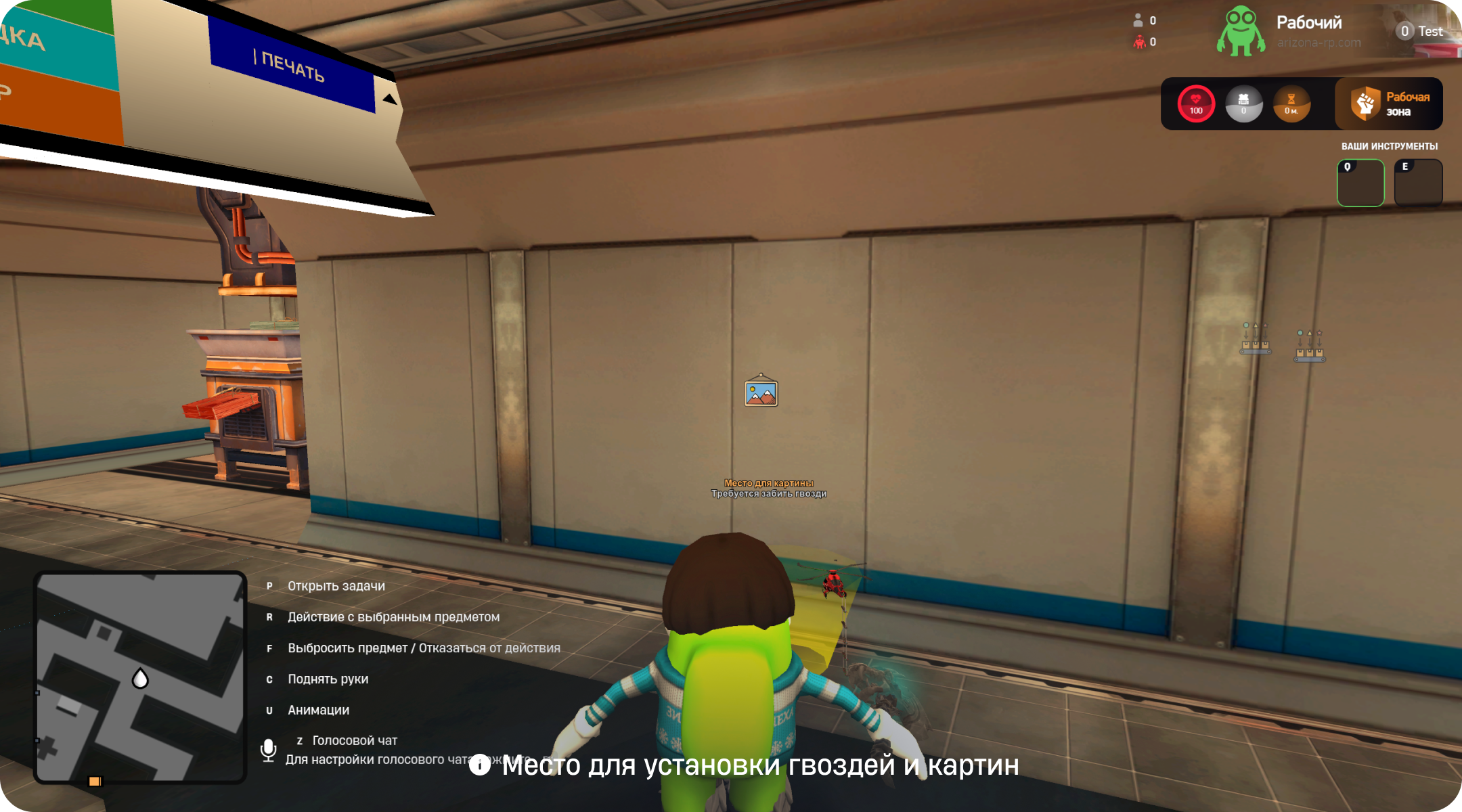Вам необходимо отправится на склад и найти там гвозди и молоток. Далее найти ближайшее доступное место, куда нужно повесить картину.