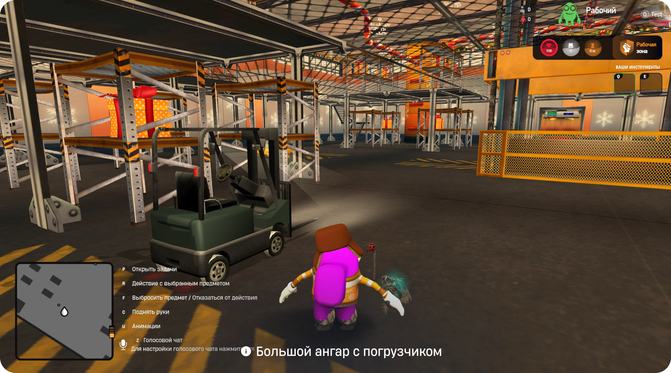 Для выполнения задания вам нужно отправится на склад и найти там ключи от погрузчика. Затем, вам нужно будет прийти в большой ангар вместе с напарником.