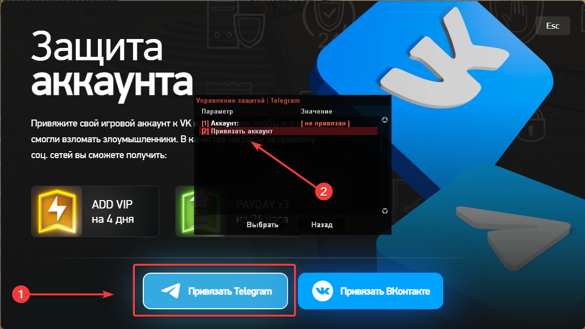 Советуем Вам привязать свой игровой аккаунт к Email, VK или Telegram, чтобы его не смогли взломать злоумышленники, а Вы не потеряли свой прогресс.