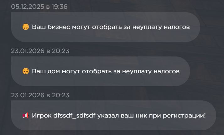В списке сообщений самым первым отображается диалог с чат ботом, он будет информировать игрока о необходимости оплатить налоги на бизнес/дом. Будет оповещать если ник игрока кто-то указал как реферальный при регистрации и если доступен промокод.
